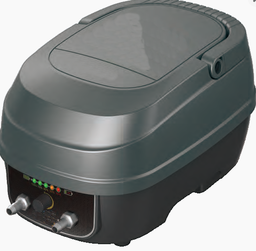 Luftpumpen skifter til batteri når strømmen går. Batteri lades igjen når stømmen er tilbake.