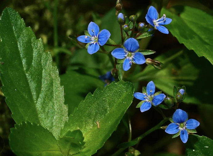 Den får små blå blomster i klaser.