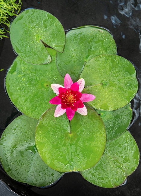 Vannlilje i stor potte, Voksedybde 20-50cm. Mini utgave av vannlilje blomst og blader.