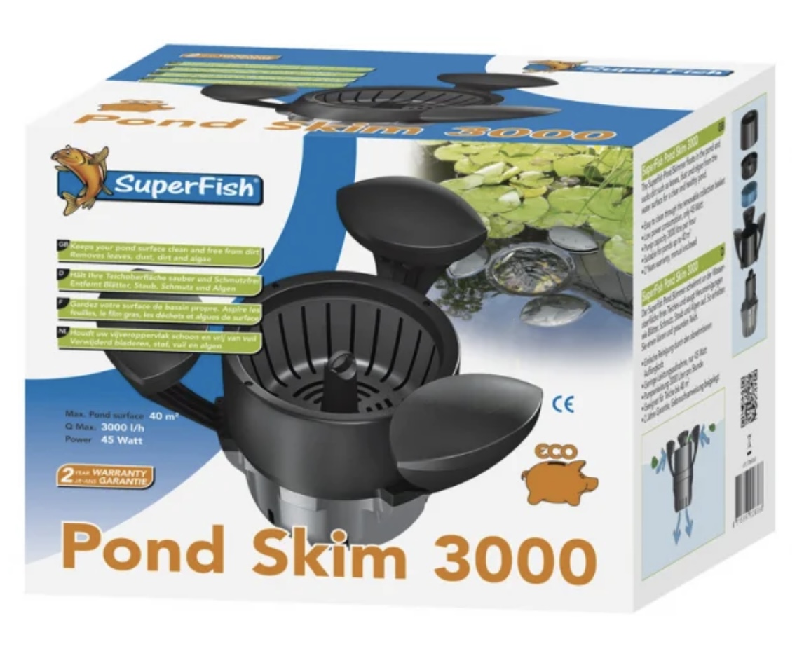 Har du problemer med løv og andre partikler som samler seg på bunn i dammen er dette en genial løsning. Overflateskimmeren fungerer ved at det hentes vann helt i overflaten, dette gjør at alt av overfaterusk blir trukket til skimmeren og samles i denne. Skimmeren har en beholder som er enkel å løfte opp og tømme når skimmeren er blitt full av rusk og blader.