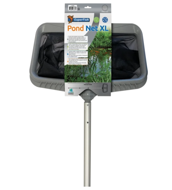Smart finmasket håv for å renske opp i dammen for alger, blader og annet rusk.